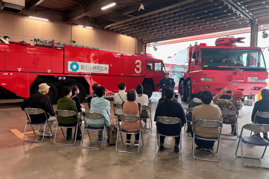 遮るものが何もない「場周道路」からの景色は絶景の一言。 さらに、巨大な化学消防車が並ぶ「消防庁舎」も見学させてもらいました。間近で見る特殊車両のメカメカしいかっこよさに、参加者も釘付けでした。 運良く飛行機の離着陸も見ることができ、目の前を通る迫力ある飛行機に大歓声が上がりました!