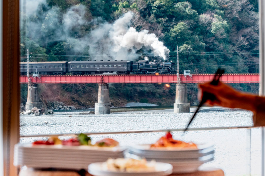 約45分のSL旅を楽しんだ後は、「川根温泉ホテル」でランチバイキングです。 窓際の席からは、先ほど渡ってきた大井川鐵道の鉄橋が見えるという絶好のロケーション!