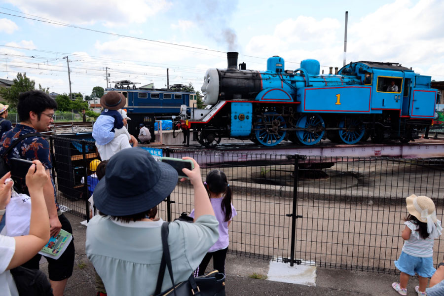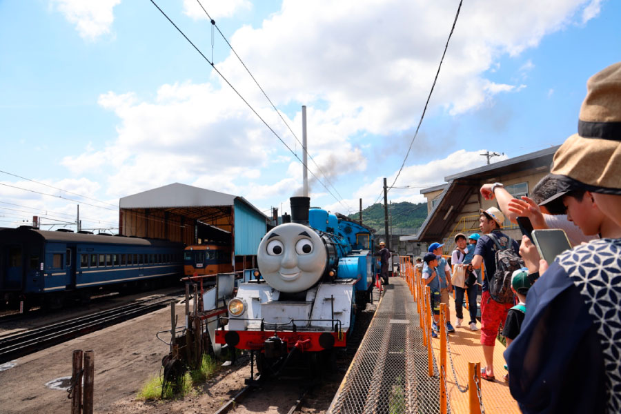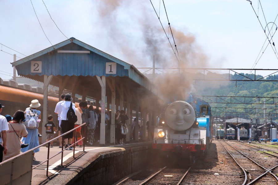 JR金谷駅に集合し、まずは新金谷駅へ。 ここでは乗車前に「トーマスフェア」が開催されていました。会場に入ると…いました!本物のきかんしゃトーマス号! 想像以上の迫力と、蒸気を上げて出発準備をする姿に、参加者全員がいきなり大興奮です。