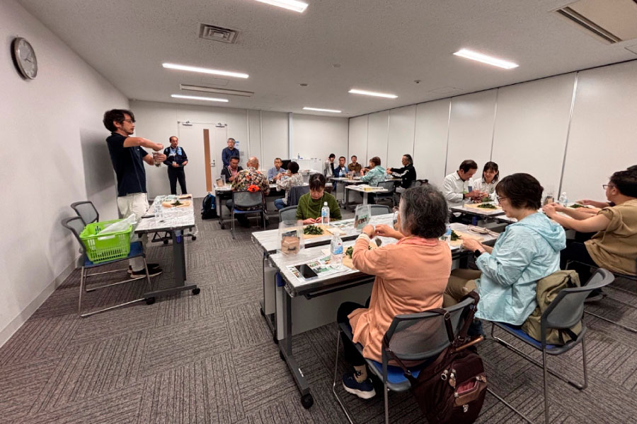 ツアーの締めくくりは、空港内の多目的会議室で「オリジナル紅茶づくり」です。今回は地元・佐京園さんの指導で、「和紅茶づくり」に挑戦しました。