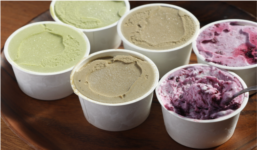 관광중의 휴식에 디저트도 인기. 오이가와의 식재료로 만드는 엄선된 젤라또를 꼭 맛보아요(가와네 녹차, 가와네 호지차, 가와네 블루베리).