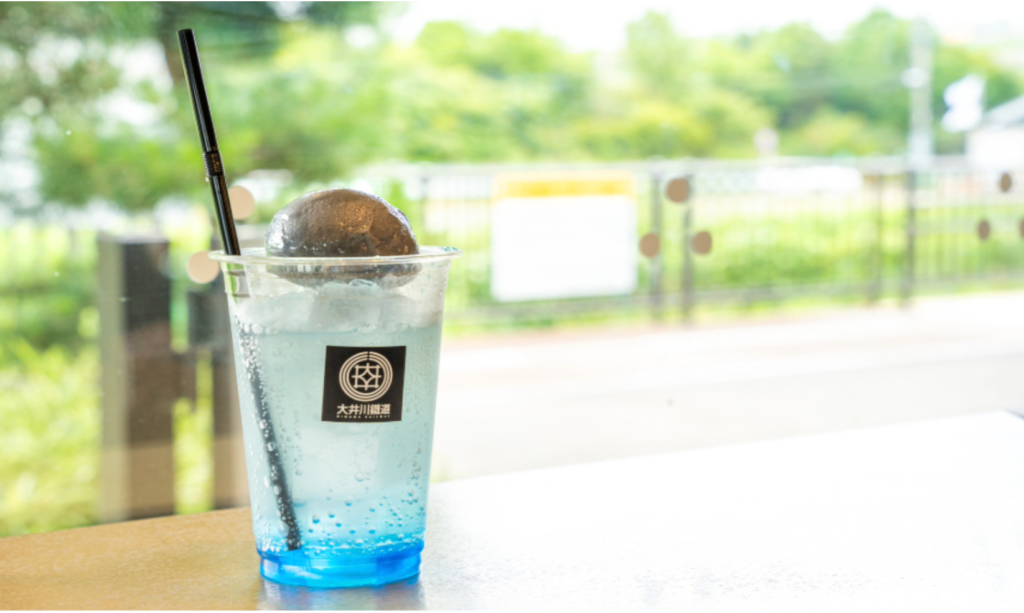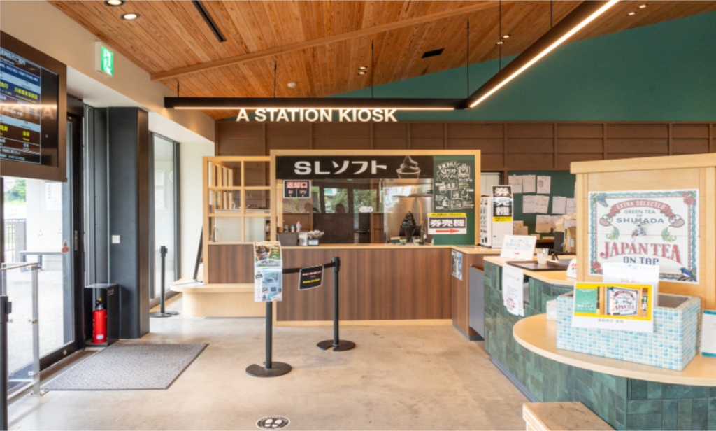 오이가와 철도 카도데역 (KADODE駅)과 직결되는 ‘A STATION KIOSK’는 TOURIST INFORMATION 시설 내에 있습니다. 타이밍이 맞으면 증기기관차를 바라보며 맛볼 수 있어요.