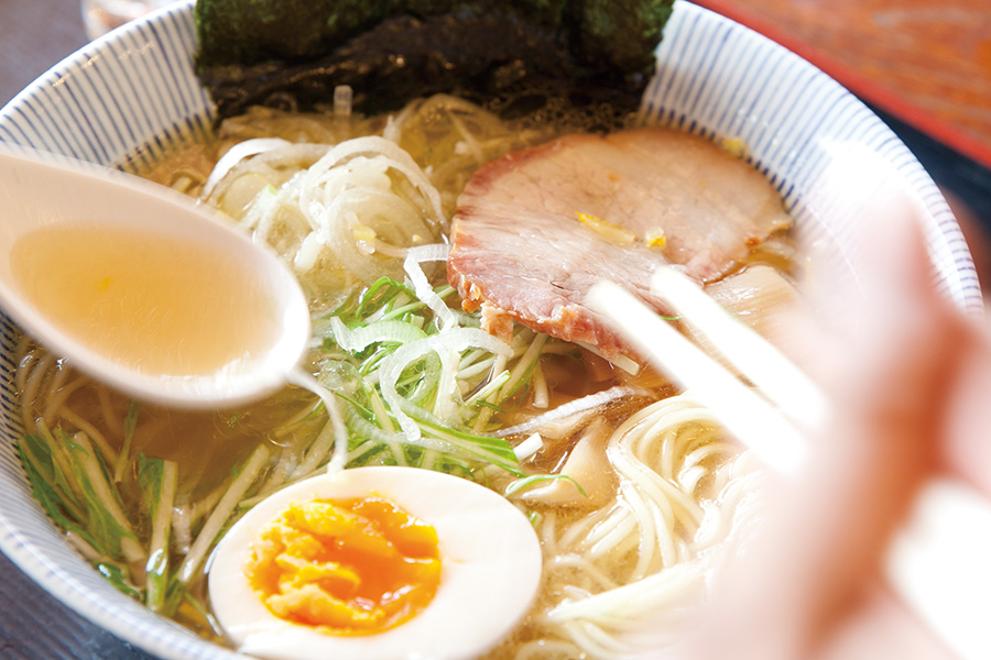 사진은 1층 식당에서 먹을 수 있는 가와네 온천수를 졸인 소금으로 만든 소금라면. 순한 감칠맛에 유자가 악센트가 된 추천 라멘입니다.