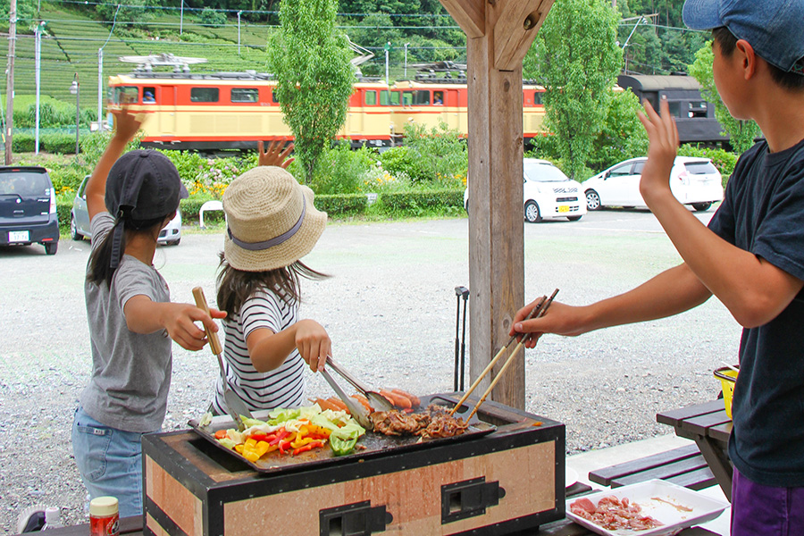 그 외에도 밖에 증기기관차가 보이는 당일치기 바비큐와 코티지, 아침에 채취한 채소가 늘어선 미치노에키도 함께 있습니다. 오이가와(大井川)를 충분히 즐겨주세요.