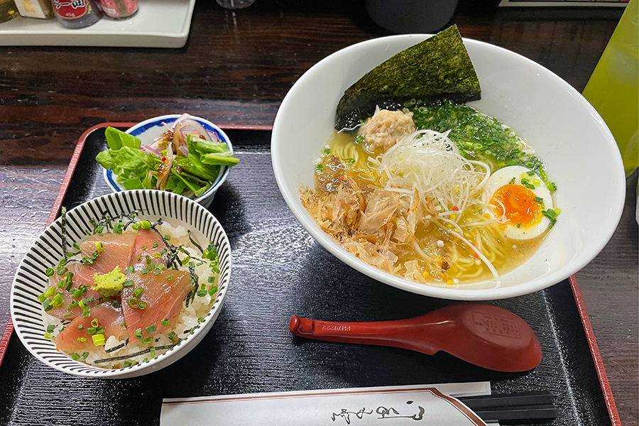 점심 시간 추천 메뉴는 ‘라면과 참치 덮밥 세트’ 입니다. 자랑하는 라면과 해산물 덮밥이 세트로 구성되어 아주 저렴해요! 배불리 드실 수 있습니다. 가성비가 뛰어납니다!