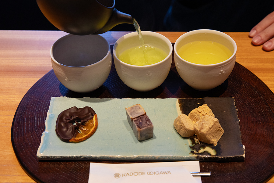 가장 인기 있는 메뉴는 3종 차의 차이를 즐길 수 있는 세트 「리큐」입니다. 3종 차에 맞춰 현지 과자점에서 주문한 다과도 함께 제공됩니다.