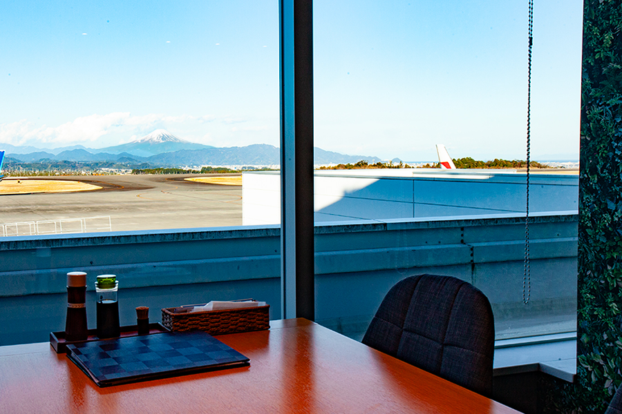 후지산 시즈오카 공항 터미널 빌딩 3층에 위치한 해산물 레스토랑. 날씨가 좋은 날에는 활주로 너머로 후지산이 보입니다.
